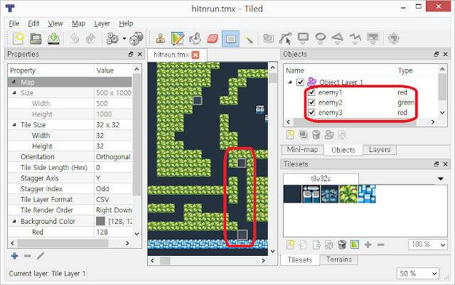 tiled에서 object layer에 object를 만들고 type에 red,green등 이름을 넣습니다.