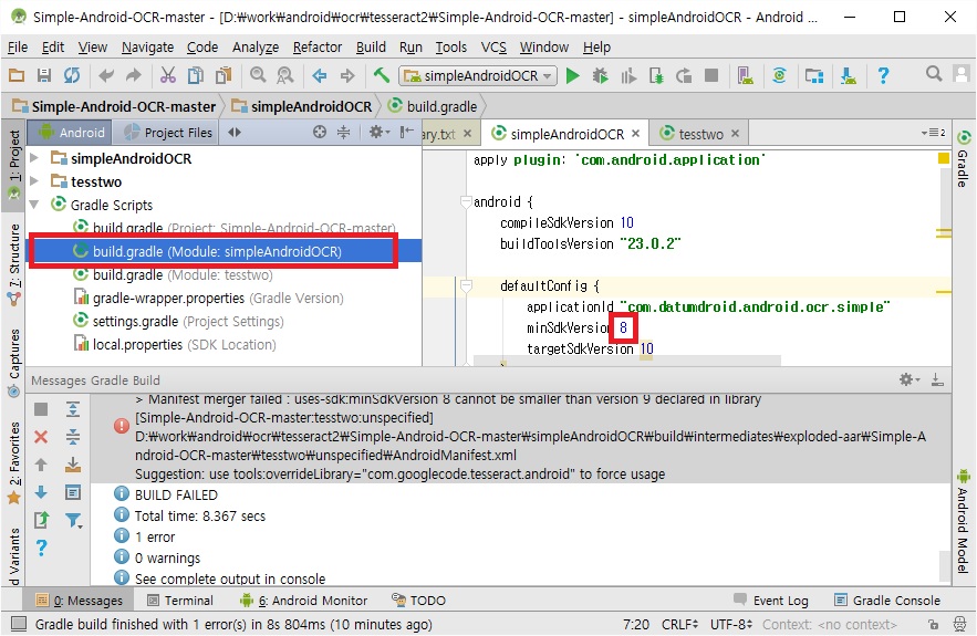 > Manifest merger failed : uses-sdk:minSdkVersion 8 cannot be smaller than version 9 declared in library [Simple-Android-OCR-master:tesstwo:unspecified] D:\work\android\ocr\tesseract2\Simple-Android-OCR-master\simpleAndroidOCR\build\intermediates\exploded-aar\Simple-Android-OCR-master\tesstwo\unspecified\AndroidManifest.xml